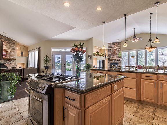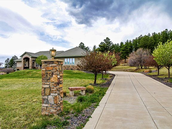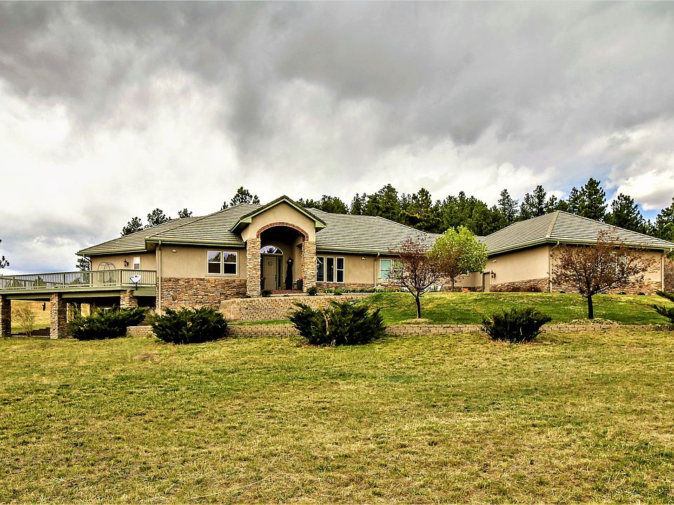 Wonderful contemporary ranch on 5+ acres with mountain views. One level living at its best in coveted Deerfield community, award winning Douglas County schools. This estate home is an entertainers dream with great flow for large gatherings. Room for everything & everyone, ideal for multi generational living. All bedrooms have ensuite baths & good closet space. Well appointed kitchen with island, ample storage in maple cabinetry, extra serving area with sink, slab granite countertops, stainless appliances, 3 ovens, counter seating, open to family room, WI pantry and appliance closet. The great room is truly great with vaulted ceilings, hand scraped hardwood floors, and stone fireplaces opens to kitchen and dining, very open and airy, lots of light great for family gatherings. Owners retreat w mountain views, walkouts to deck/patio, 2 WI closets, 5 piece ensuite bath w double shower and jetted tub. Study on main level is ideal for working at home but also has ensuite bath and walk in closet and can be used as 5th bedroom. Lovely fenced yard with covered patio. 3 additional patios and massive wrap around deck to enjoy the beautiful scenery and mountain views. Walk out lower level has guest bedroom w ensuite bath, rec room, family room, large space to expand if needed and half bath. Magnificent huge oversized garage w 12ft ceilings, finished, heated, abundant shelving, large window, two exterior doors, attic storage, very deep could accommodate a lift or a workstation. Great for classic cars, a boat, hobbies, garage enthusiasts will love this space! Room for additional structure off driveway. Homes like this are rare and hard to find. Need space Then this is your place! Come and see.