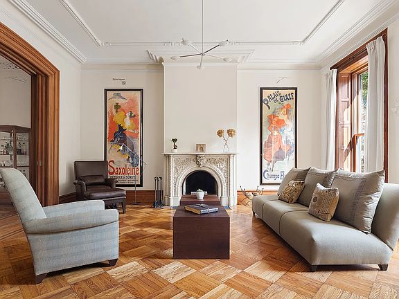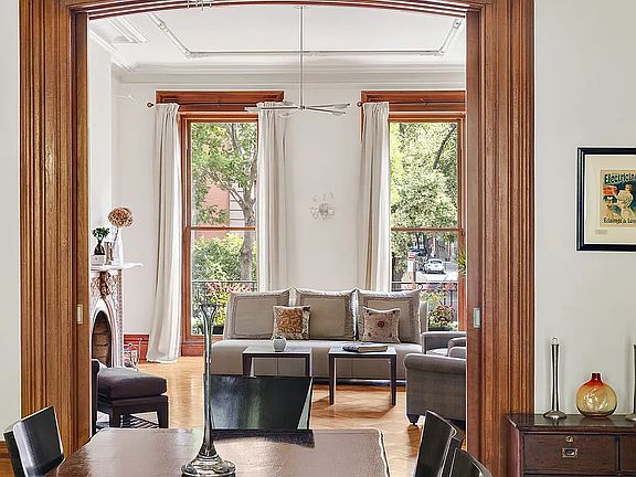 The front steps rise to a dramatic double-door entry accessing the vestibule which opens to the?original grand staircase and?gracious?parlor floor with soaring 12-foot ceilings. The sun-filled living room and formal dining room?are beset by hard wood flooring, custom millwork, fine picked?plasterwork, marble mantels, shuttered windows, and?more?charming details. Step into the immaculate gourmet?kitchen overlooking the garden, with an abundance of custom cabinetry, honed black granite countertops, a?deep oversized sink, and stainless-steel appliances.?