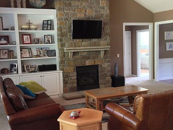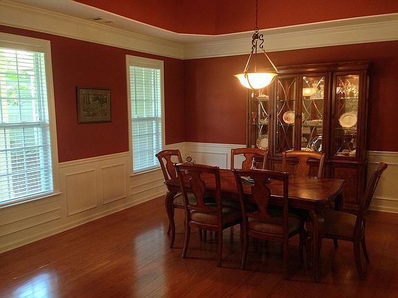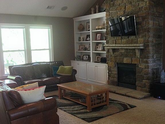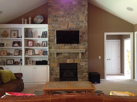 Beautifully upgraded Americana plan on a **premium level lot.** Full of extras like floor to ceiling stacked stone fireplace in great room (wired for TV), built in speakers for surround sound, and gorgeous custom built-in cabinets. **Kitchen-Aid stainless steel appliance package**, stainless Samsung refrigerator, granite counter tops, island, maple cabinets, & hardwood floors in kitchen, foyer, dining room, powder room and hallways. Large Owner's Suite and tiled bath with raised dual sink vanity, garden tub, separate shower, linen closet, and spacious walk in closet. Split bedroom plan offers 2 additional bedrooms with adjoining bath that features dual sink vanity and tub/shower combination. Covered back porch overlooks wooded, private & level backyard. GE washer and dryer appliances included with the home.