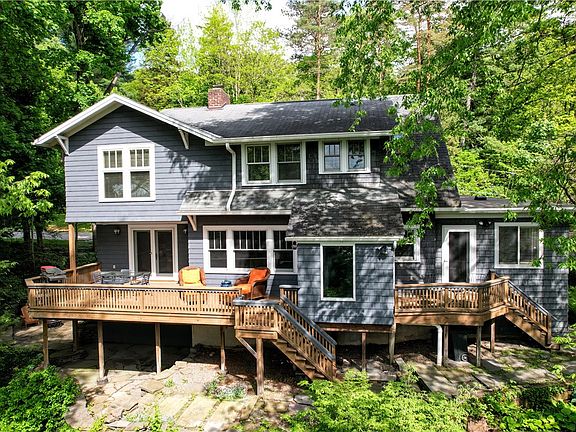Elegant 1920s Arts and Crafts-style home offering stunning living space both inside and out. Ideally located on a quiet cul-de-sac within walking distance to Cayuga Heights, schools, parks, Ithaca Falls, the lake, and downtown Ithaca, this home combines modern amenities with vintage charm and character. Impressive, light-filled interiors boast gleaming hardwood floors, exposed beam ceilings, rich woodwork, and an open living area centered on a masonry wood-burning fireplace framed by graceful arched doorways. The custom-designed kitchen is a true chef’s haven, blending beauty and function. Striking black marble countertops pair with a classic farmhouse sink and backlit glass-front cabinetry to create a warm, inviting workspace. Crisp subway tile with bold contrasting black grout beautifully complements the high-end Sub-Zero and Bosch appliances. Clever built-ins provide smart storage and organization, and a large west-facing window frames the afternoon sun. A spacious family room features large windows bringing in morning sun while overlooking the lush backyard. The main-floor guest suite is complete with a beautifully tiled shower trimmed in marble and access to a private deck. This space also functions as a main-level primary suite. Upstairs, the primary bedroom features cathedral ceilings, exposed brick, and a walk-in closet. The upstairs lounge with built-in bookshelves provides the perfect space for a home office, library, or den. A spacious 3rd bedroom, a versatile 4th bedroom or additional workspace, and a luxurious bathroom boasting a marble-tiled shower, rainfall showerhead, massage jets, tiled bench, and skylight complete the upper level. This home also features radiant in-floor heating, a full walkout basement for added living or shop space, and beautifully landscaped grounds with extensive gardens, patios, and stonework. Off the family room and kitchen, an expansive deck offers space to soak in the afternoon sun, host gatherings, grill, or relax beneath the glow of sunsets. Glimpses of Cayuga Lake can be seen from various vantage points. This exceptional home offers a rare combination of elegance, comfort, and accessibility. Turn-key condition!