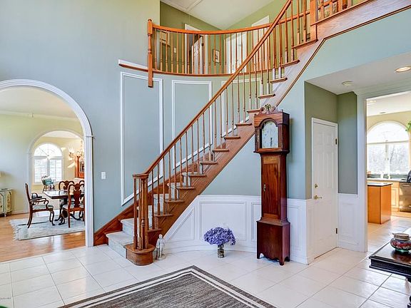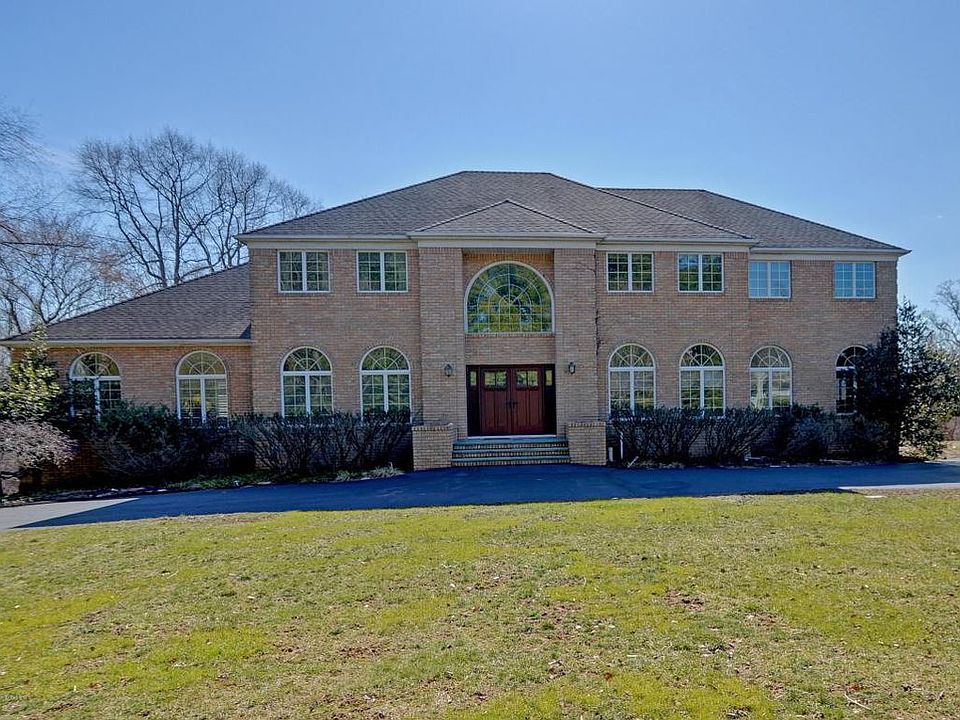 Drive through this prestigious neighborhood, very close to Holmdel Park, and discover this stately brick front home with over 5100 sqft. of living space. Step through the custom double door front entry into a grand two-story formal entry foyer with circular solid oak staircase, wainscoting, and solid oak railing and spindles. The foyer leads to the sprawling first floor with ten foot ceilings and amazing elegant archways and custom moldings. Both the living and dining rooms have hardwood floors and arched transom windows. Huge family/great room, perfect for entertaining, vaulted ceiling with 2 oversized skylights, plantation shutters, and a wood burning fireplace with marble hearth and surround. Kitchen has a sun drenched all glass breakfast rotunda overlooking the