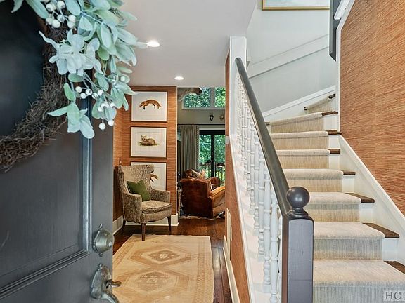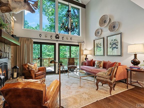 Beautifully styled & offered turnkey, Fernwood Cottage rivals any designer showcase home on the plateau. This exquisite home is filled with the finest furnishings, rugs, linens, wall dressings, custom draperies, & accessories from top design stores in Highlands & Cashiers, including Toby West, Acorn's, Dutchman's, & CK Swan. Perfect for those seeking a luxurious mountain lifestyle, Fernwood Cottage leaves nothing to be desired. The cozy interior features two large master suites with vaulted ceilings, connected by a loft library that overlooks the great room. The great room is highlighted by a floor-to-ceiling stone fireplace & a wall of windows showcasing long-range western mountain views of Flat Mountain & Billy Cabin Ridge. This elegant space invites warm gatherings & transitions seamlessly onto an expansive deck, perfect for entertaining, sharing stories, & stargazing with friends. A third bedroom on the main level, designed as an English-inspired office, can be closed off with pocket doors for privacy & offers access to another full bath & walk-in closet. The kitchen & bathrooms boast stone countertops, heated floors, beautiful tiles, & custom wall dressings. Additional features include a two-car garage & an encapsulated crawl space for peace of mind & protection from inclement mountain weather. Since ownership, the current owners have meticulously maintained & upgraded the property, including replacing the roof, paving the driveway, replacing a retaining wall, staining the decks, fencing & gating the yard, rebuilding the front steps with reinforcement, rerouting drainage areas, beautifully landscaping the yard, & adding a wonderful fire pit. Hop on the nearby trailhead & stroll into town to enjoy ice skating in Kelsey-Hutchinson Park in the winter & concerts in the summer, or take your furry friend along for a nature stroll. All items in the home remain, so just bring your toothbrush, head up our way, & discover why so many people fall in love with our town.
