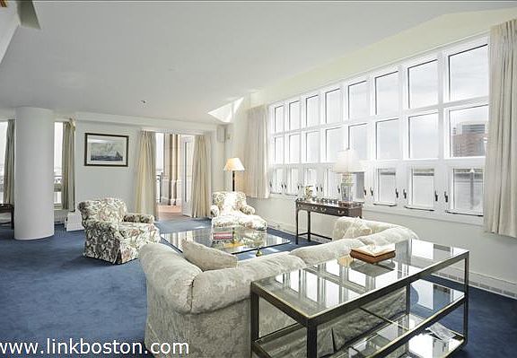 This one-of-a-kind Waterfront Residence, located at prestigious Rowes Wharf, has unobstructed Harbor Views. Filled with sunlight and the sounds of The Waterfront, the grand living / dining room has three walls of windows and a door leading to the large, private terrace. There is an eat-in-kitchen, powder room and entry foyer downstairs. Master Suite has ample closets and en suite marble bathroom. A guest suite and den / office are located upstairs. There is a laundry room, private storage and two deeded garage parking space. The Residences at Rowes Wharf offer luxury services, 24-hour Concierge, valet garage parking and access to The Rowes Wharf Health Club pool, spa, Water Shuttle to The Airport, a marina, room services and all the restaurants. Rowes Wharf is situated on the center of Boston Harbor and across the street from The Greenway, The Financial District, and steps from Faneuil Hall, World Trade Center, and Historic North End. The 100 Residences at Rowes Wharf were built in 1987 and are impeccably managed by Barkan Management Company.
