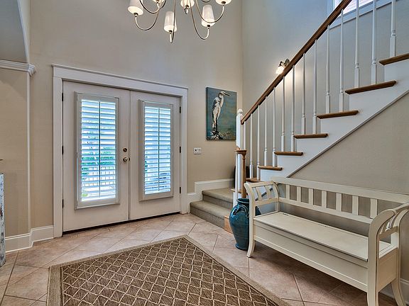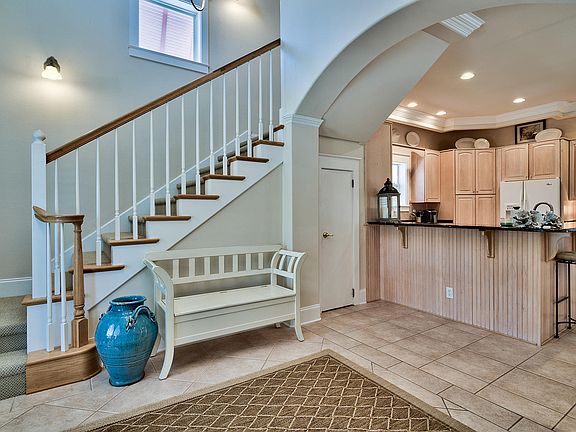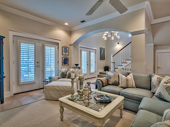 Enjoy the serene surroundings offered by this Caribbean style beach home located in the gated, Gulf-front community of Caribe. The gated and lushly landscaped entryway to the home welcomes each guest with soft exterior lighting showcasing the home. Upon entering the front door, you will be greeted by expansive 24' foot ceilings in the foyer, setting the tone for the custom fit and finishes which can be found in every room of the home. The 12' foot ceilings found throughout the living area and kitchen, combined with the custom columns, arches and crown molding, provide for an open and inviting space, perfect for family gatherings. The calming, beach inspired color palette found throughout the home gives you a sense of relaxation and reminds you that you're just a few steps away from the beach. The first floor is encompassed by the main living area, kitchen, dining area, laundry room, master bedroom, and a half bath. On the second floor you will find plenty of room and privacy for each of your guests, which provides two spacious guest bedrooms, each with its' own bathroom. Other notable features of the home include: granite counter tops in the kitchen, along with a built-in desk, as well as two spacious, semi-covered porches and an exterior shower. This home is ready to go for the rental program, but would also serve as great second home or full-time residence. Caribe's 100+ homeowners enjoy access to a private beach with two walk-overs, golf-cart parking, two resort pools and on-site tennis courts.
