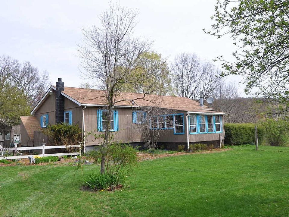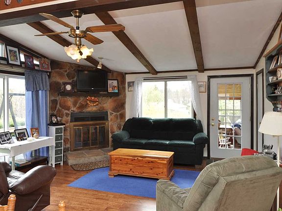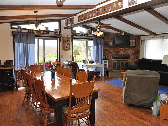 This private, cozy three-bedroom Ranch has an open floor plan with a master bedroom en suite. The living room features a stone fireplace and leads out to the sunroom with a hot tub. Home also features a large eat in kitchen with sliding glass doors that open to the porch with eastern views. A convenient laundry room on the first floor which opens to the 2 car garage. This 2+ acre property boasts beautiful fruit trees and a 2-bay metal workshop/machine shed all conveniently located to the quaint village.
