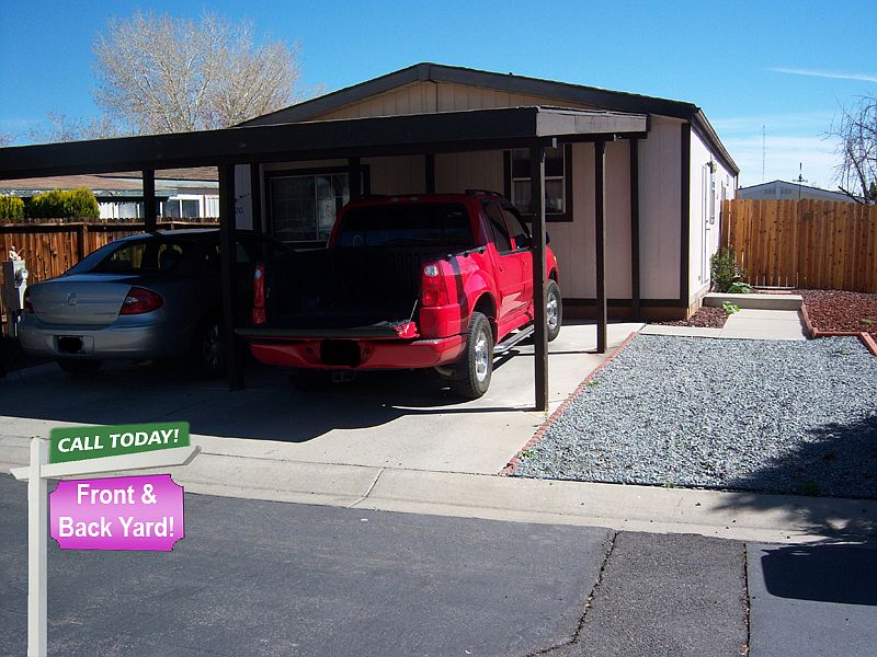 Must see this very nice, well cared for home. Interior Features: A ‘90 Champion (24 x 44) 1,056 sq. ft. 3 bedrooms / 2 baths with a split-bdrm floor plan. The living room is open to the dining area and to the kitchen. All walls are painted and the vaulted ceilings create spaciousness. Newer items: kitchen counter tops, sink, vent-a-hood, some faucets, the furnace and hot water heater, and the carpeting in 2 bedrooms. Exterior Features: Side-by-side carport plus an additional parking space. Charming fenced bk yard with easy care landscaping — gravel with paver walkways gazebo, planter boxes and very nice shed. Terms: Bank financing may be available On Approved Credit. Call today for additional details! Click here for application! For questions or to schedule your private showing, contact: Beverly Calton-Hoffman (775) 233-3716