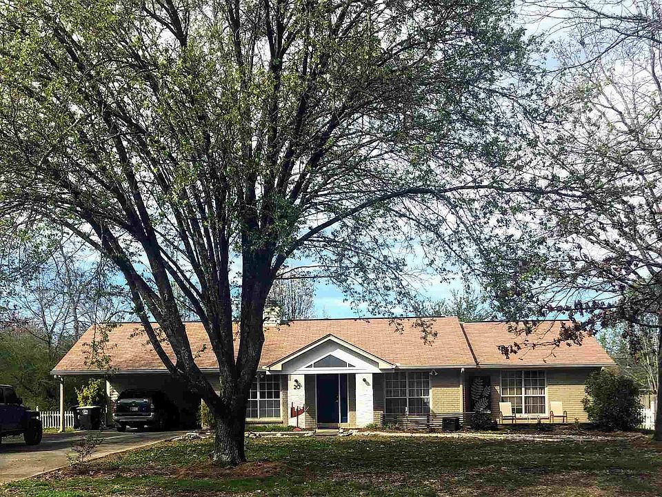 Must see this unique contemporary brick home. Well maintained. Level lot. Friendly neighbors. Renovated kitchen w quartz counter tops, ss oven/range w hood and ss dishwasher. Recessed & track lighting. Bay window in breakfast area. Open concept kitchen into LR w vaulted ceiling in LR/DR. hardwoods. Dual view wood burning fireplace w 3D tiles/stone. Custom sliding window covering large window in dining room. Master bedroom has lighted feature wall, custom floating headboard/nightstands, custom sliding closet door into walk in closet. Custom glass sliding door entry into master bath with tile shower and floating vanity and storage cabinets. Covered back porch, water features, fenced back yard, out building w power and lots of storage.