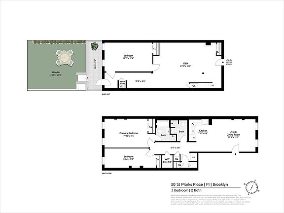 Spacious Duplex with Private Outdoor Space in Boerum Hill, Brooklyn Size: 2,200 sq. ft. Duplex Outdoor Space: 600 sq. ft. Private Garden Location: St. Marks Place, Boerum Hill, Brooklyn Nearby Transit: Atlantic Ave Station (LIRR & Subway lines 2, 3, 4, 5, B, D, N, Q, R) Description: Discover this stunning two-bedroom (flex three) duplex nestled on the picturesque, tree-lined St. Marks Place in Boerum Hill. This residence offers an expansive 2,200 sq. ft. layout with 11' high ceilings, hardwood floors, exposed brick, and abundant natural light. Features: Living Space: Enter the spacious 60 x 20 parlour level to find an open-concept living, dining, and kitchen area. The kitchen has modern appliances, including a microwave, dishwasher, fridge, stove, oven, and range vent. Bedrooms & Baths: The rear section of the parlour level includes two bedroomsa queen-sized room with a closet and a king-sized master suite featuring an en suite bathroom with a Jacuzzi tub and shower. Lower Level: The expansive lower level offers a versatile 59 x 19 recreation space, which can function as a third king-sized bedroom, home office, gym, or creative studio. This floor also includes a large storage closet, under-the-stairs storage, and direct access to the private garden. Private Garden: Enjoy over 600 sq. ft. of south-facing outdoor space, perfect for relaxing, entertaining, or enjoying a quiet evening. Location: Situated in a prime location, this duplex is just three blocks from the Atlantic Avenue transportation hub, offering easy access to the LIRR and multiple subway lines (2, 3, 4, 5, B, D, N, Q, R). The neighbourhood is a vibrant mix of dining, shopping, and cultural venues, with close proximity to 5th Avenue in Park Slope, Smith Street in Carroll Gardens, Atlantic Avenue, Fulton Mall, Barclay's Center, BAM, and more. Extras: In-unit washer/dryer Central AC Massive storage closets Virtual staging photos