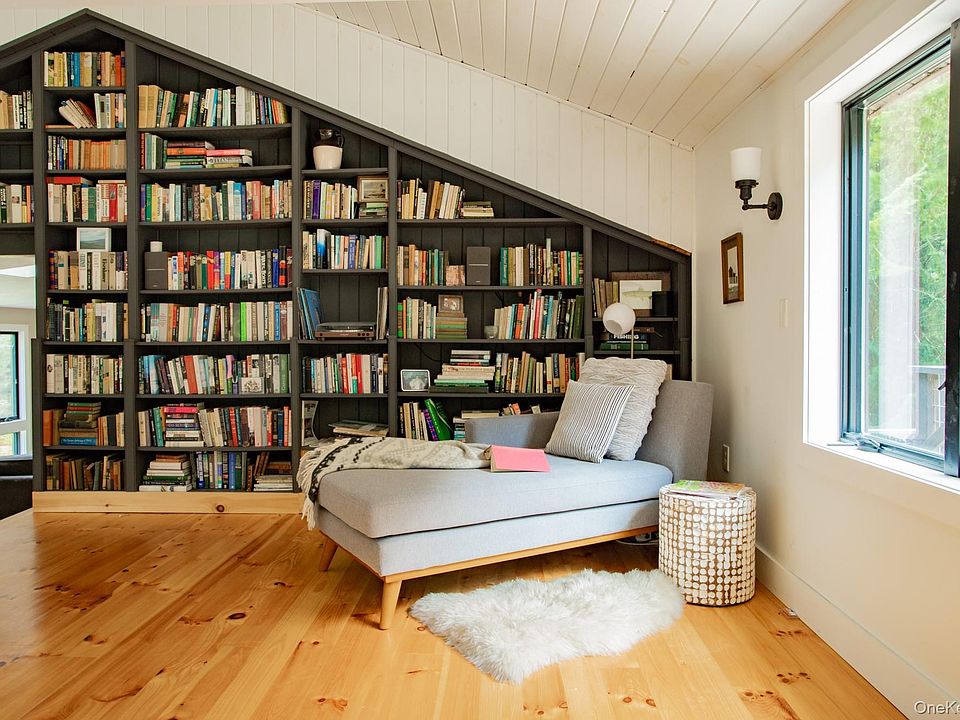 - Description: Great Room with full-wall bookcase, deck access