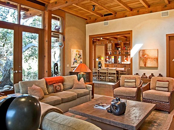 This Frank Lloyd Wright inspired gated retreat offers a total of 3 bedrooms and over 3,700 sq. ft. of living space accented with rich wood -beamed ceilings and walls of glass open to lush gardens and stunning mountain views. The guesthouse has a kitchen and bath and is adjacent to a separate artist's studio. Let there be no doubt; this is your.gated country retreat in Carmel Valley.