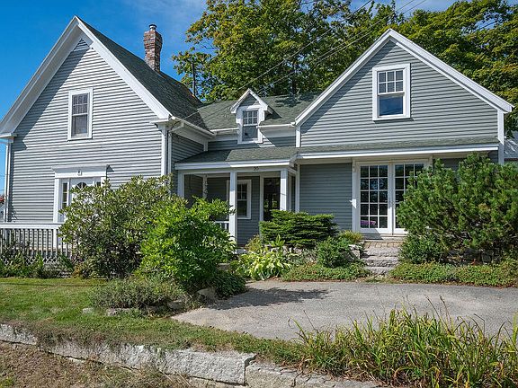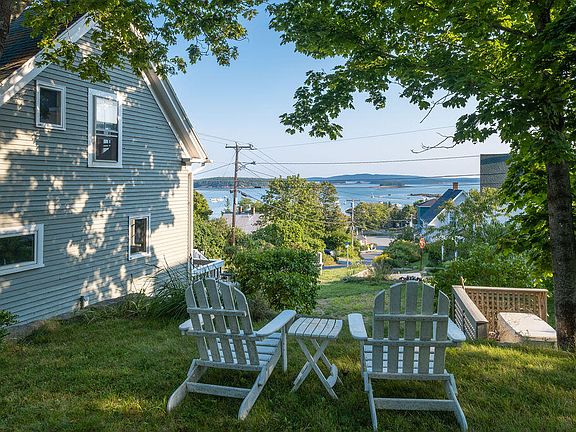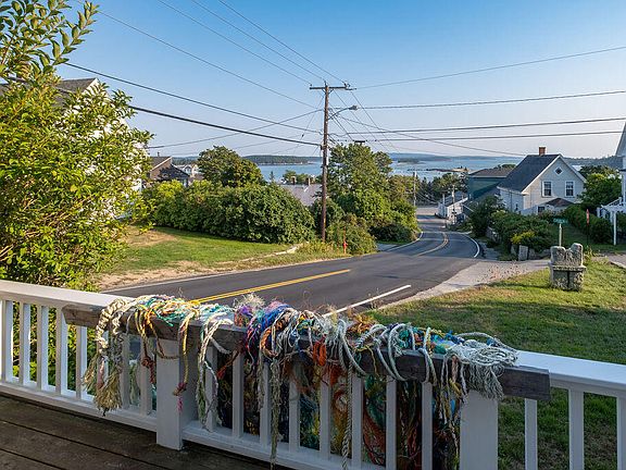 Hillside Stonington Village home with panoramic, elevated views of the Harbor, the archipelago and beyond. This 2-bedroom, 1.5-bath, in-town charmer was renovated with the assistance of an architect in 2013. The result is a darling home with a small footprint, pleasing lines and ample windows to take in the southern light and sparkling ocean views. A walkway lined with perennial plantings leads you to the covered porch that connects to the larger front deck, the perfect place to relax and watch the boats come and go from the harbor. The main entry takes you into a spacious hall that provides a warm welcome to the home, with a laundry room beyond and the attached storage space to the right. Beyond the entry hall is a full bathroom and an open living area (with the opportunity to add a small wood stove), kitchen and dining area with ocean views glinting from the south-facing windows. Upstairs is a study/den and two inviting bedrooms, one with direct access to the lush side yard and the other with a wall of windows allowing light and views to fill the space. This room is large enough to accommodate sleeping and studio/hobby or work space. An adjacent lot was purchased adding green space for gardens and lawn as well as additional parking and storage. Thoughtful landscaping, granite steps, walls and sculpture allow for some privacy and a secret garden feel. Just steps away from the Opera House, restaurants, shops and the harbor!