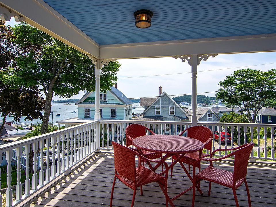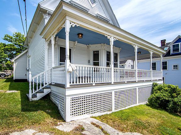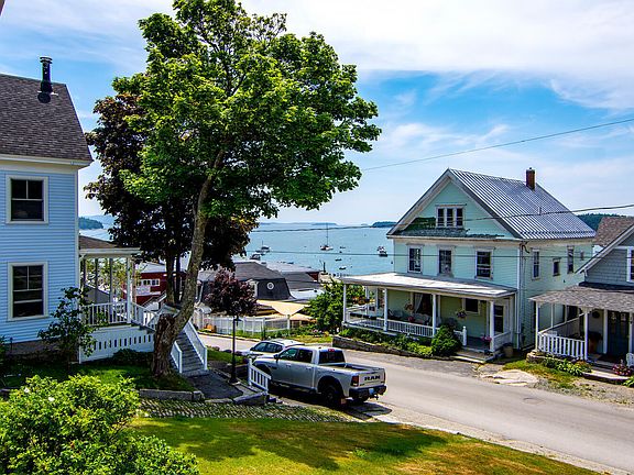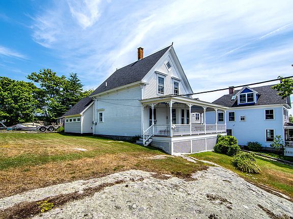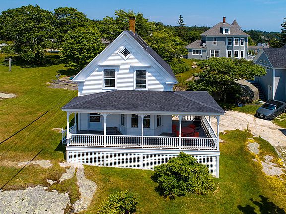 Ocean Breeze- A classic, ocean-view Victorian home, sited on the hillside in Stonington Village. The perfect perch from which to enjoy in-village living, Deer Isle Thorofare views and outstanding sunsets. A wrap-around porch with Victorian gingerbread details and excellent water viewing space is the focal point of this proud home. A newly rebuilt, attached garage provides parking, storage and workshop space as well as a laundry and entry area. From the garage, you enter a country kitchen with newer appliances. The dining area is off the kitchen and open to the living room, allowing for light and views from both spaces, wood flooring, tin ceilings, a central wood stove and ornate trim work add character and comfort. A front hall leads to the second floor as well as the west entrance of the home (the waterside) via the deep covered porch. On the second floor there are two generous-sized bedrooms and a full bathroom. The west bedroom has broad views and great light, and the east bedroom has island-dotted views and ample closet space. A finished attic, accessible from the second floor hall, also has water views and has been used for overflow sleeping and living space. The yard features exposed granite, lawn rolling towards the water (very Stonington!) and a cobblestone driveway paved with granite blocks (shared with the neighboring property). Facing west with open views through the Thorofare to Greenhead, Crotch Island and miles of scenic ocean and islands beyond. This home is offered furnished, an excellent opportunity to start enjoying the Maine island lifestyle.