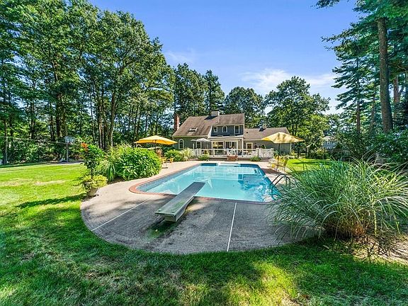 Gorgeous bright and sunny Colonial located in coveted Marshfield Hills neighborhood on a lovely cul-de-sac. First level features a new cooks kitchen with marble counters, solid wood cabinets, double wall oven, warming draw and wine cooler open to an impressive great room w/ cathedral ceilings, gas fireplace w/ sliders to an outdoor living oasis with an oversized composite deck, heated in-ground pool and patio/cabana area with built in gas hook up for grill. First floor also includes a spacious dining room and living room or great home office. Upstairs you will find 4 spacious bedrooms, a master bedroom suite with new master bath, and a second full bath. The finished basement provides extra play space and abundant storage. Handy attached 2 car garage. All set on 1+ acre abutting conservation land! Eames Way school! Short distance to Humarock Village/Beach and convenient to shopping, highway, commuter rail, marinas and all that Marshfield has to offer! 1st showings Sat 5/11 1-3pm.