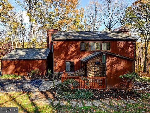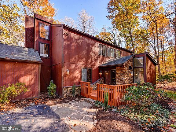 If you are looking for a private & peaceful location surrounded by nature and overlooking trees and a stream, this is one you won't want to miss! This stone & cedar 4 BR 3 1/2 BA contemporary is on 2.5 gorgeous acres on a private driveway at the end of a cul de sac and has many upgrades and updates! The main level has an open floorplan with gleaming hardwood floors, 2 sided woodburning fireplace and flexible room choices to fit your lifestyle. The granite & stainless Kitchen w/an island & fireplace has a 3 sided glass breakfast room overlooking the 2 level deck and treed yard. There is also a Family Room off the Kitchen, Laundry Room, Living Room, Dining Room and Powder Room on this level. The upper level, also with hardwood floors has 4 Bedrooms & 2 Full Baths, the Primary Bedroom with a wood burning fireplace & private deck. The finished walkout Lower Level includes a Rec Room with Pool Table area, office and full bath plus storage. Recent upgrades include a 3 Ton Trane HVAC (for main and lower level), new garage opener, well pumps (2024 & 2018), Roof (13 yrs) and resurfaced driveway (2024). Seller has also roughed in underground low voltage wiring in the event Buyer is interested in adding additional lighting & fenced in a portion of the rear yard. Come see this home today!