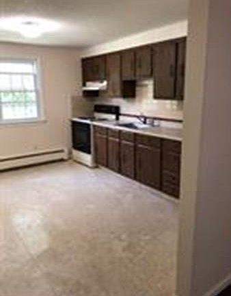 Live in the country and still have access to MA & NH border cities or towns. This 2 bedroom third floor unit has a 15x13 living room area adjacent to the eat in kitchen which faces the common land yard area. This apartment is on the third floor of a small 6 unit building that is part of a 3 building complex located near Route 119. Kitchen has an electric stove, refrigerator, ample cabinets as well as a deep pantry closet and with vinyl flooring. There are two generously sized bedrooms.