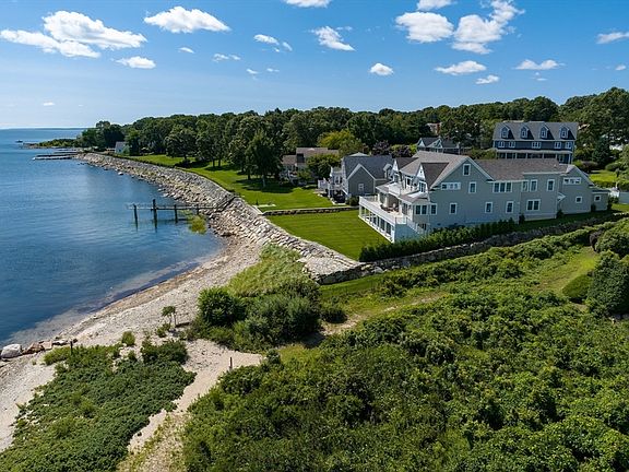 Seaside masterpiece . . . Underpinned by a sense of openness and lightness, the inspirational views of Buzzards Bay anchor 'most every room of this unparalleled oceanfront home. Understated sophistication & attention to every detail set the tone for this versatile open floor plan. Exquisite foyer is framed by a graceful arch, leading to formal dining room with custom built-in buffet cabinet spanning the length. A stunning gourmet kitchen with oversized quartz island spills into the casual yet elegant living room with several distinct entertaining spaces. The home offers two glamorous primary suites, one on each level, both with luxurious bathrooms as well as two additional bedrooms and baths, versatile family room/bedroom, and dazzling home office. The fine craftsmanship includes coffered and tray ceilings, custom millwork, wide plank beech tree floors. Enjoy a private sandy beach with room for a waterside pool.. minutes to Padanaram Village with its shops, restaurants, yacht club . .