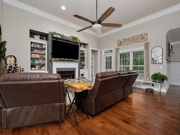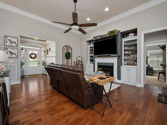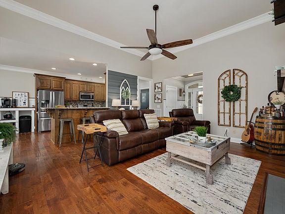 Get the best of both modern and country with this beautiful, single-level living home just minutes from the lake. This home offers so many handcrafted details that truly make it a warm and inviting place to be. From the wood detailed walls throughout, the built-ins and fireplace, to the cozy covered back porch, this home is ready for you to make it home. Need additonal entertainment space? The oversized bonus room allows for the perfect game day entertainment spot.