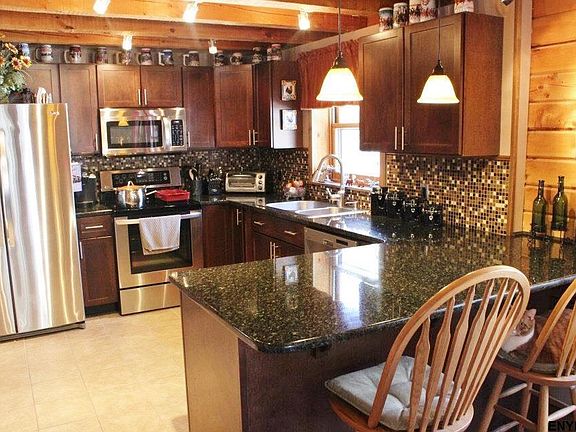 Spacious, meticulously maintained home! Sleek gourmet kitchen open to dining area w/new flooring, cabinets, and backsplash w/granite counter tops. All high-efficiency appliances. New pellet stove in living room. All bathrooms updated. Home boasts knotty pine walls, comfy covered porch and rear deck. Standby generator w/bypass switch. 2 car garage & workshop, both heated. Shed has electric! Less than 1 mile to Grafton Lake State Park; Dyken Pond & Martin Dunham Reservoir nearby. Agent related to seller.