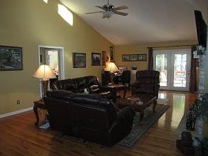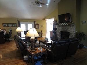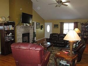 The home sits on a huge corner lot and offers over 2, 000 square feet, large open kitchen with lots of cabinets, solid surface countertops, brick fireplace, trey and cathedral ceilings, hardwood floors throughout and a huge deck the length of the home with a partially covered area, lots of room under the home, great for a workshop or just storage. A must see!