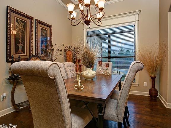 Immaculate home in the Chenal Valley"Talmont" neighborhood. This four bedroom home has beautiful hardwood floors throughout including the master suite and the 4th bedroom (could be an office). The detailed ceilings in the dining room and great room are amazing.The open kitchen has lots of cabinets plus a pantry. The outdoor space includes a covered porch with stained/stamped concrete overlooking woods. All the concrete is stained/stamped including the driveway and walk. Beautiful views all around this home!