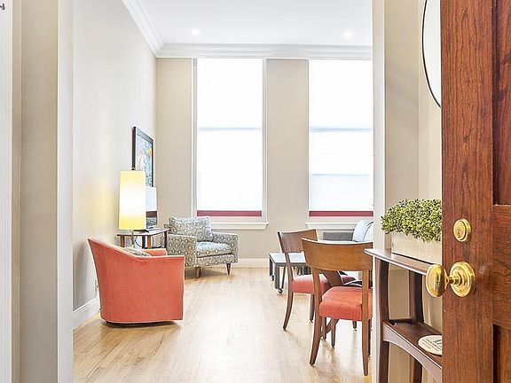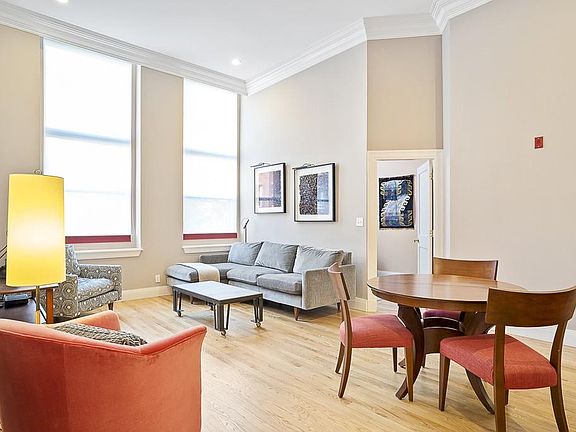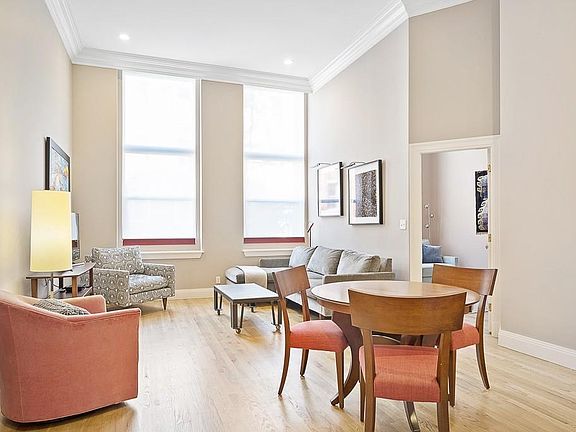 Soaring 12ft+ ceilings and double high windows welcome you into this elevated first floor home overlooking the beautifully landscaped courtyard at coveted Columbus Court. The open floor plan begins in the entryway featuring a double closet and progresses into the living space which is large enough to accommodate a dining area as well. The bedrooms unfold to the right and left. The master suite is complete with a walk-in closet and en suite bath. This home is outfitted with custom shades and new hardwood floors throughout and includes parking for one car in a tandem space as well as a storage unit. Columbus Court is professionally managed and residents enjoy a beautiful common roof deck and guest parking. Well located in the charming North End just a few blocks to the Harbor and public transportation.