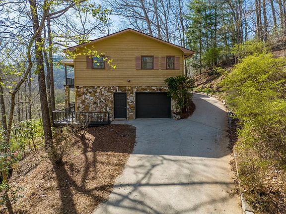 Newly renovated 4-bed, 3-bath, custom home located in gated Mill Creek golf course community. The property features long-range mountain views, a stone wood-burning fireplace, and shiplap focal walls. New flooring throughout the entire 2500 +/- sq. ft. home, along with new appliances, granite countertops, and custom cabinetry. There is an abundance of natural light with tall windows lining the walls allowing for a stunning view from almost every room! There are two covered decks overlooking a bold view of the Nantahala Mountains, both accessible from inside and outside the home. Main level living, split bedroom floorplan with 2 bedrooms on the main and 2 downstairs. The primary bedroom features a walk-in closet, double vanity sinks, and a sliding door to covered deck. The home is paved to door and has a one-car attached garage in basement with newly finished floors. Easy to maintain yard with fresh landscaping. High-speed Optimum cable internet is available. Sensible restrictions with the property. Only 10 minutes from downtown Franklin! Video Tour on YouTube.