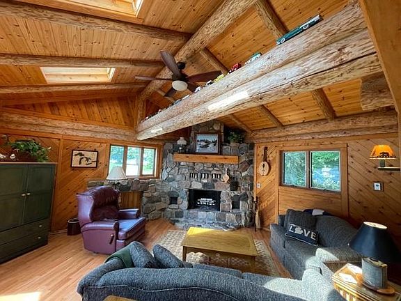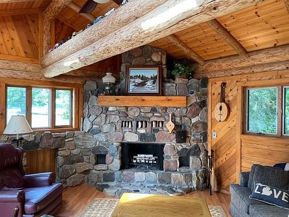 TREASURE ISLAND LAKEFRONT - Beautiful home with true ''lake cottage'' charm. Spectacular setting and lake views with pure sand beach. Enjoy the serenity and privacy of island living on Higgins Lake and the calm water this protected location provides. Hand cut and peeled logs accent the superb construction with 6'' walls and rough sawn cedar exterior, Anderson Windows and 50 year shingles. The interior features vaulted ceiling, natural stone fireplace and log beams in the living room, a family room with lake views that makes a convenient 4th sleeping area with comfortable sleeper sofa, open kitchen/dining area that adjoins the large cedar deck, oak and ceramic flooring in main areas. Extra size lot provides spacious front and back yards for recreation.