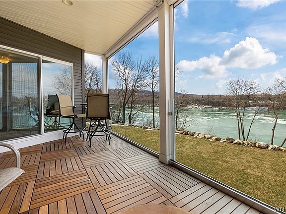 RARE OPPORTUNITY to purchase this waterfront one floor condominium situated in the Village of Lewiston! Overlooking the Lower Niagara River and Canada the views are second to none! Welcome to River's Edge, Village of Lewiston's only waterfront condominiums. This home lives like a ranch w/ no step entry from garage or foyer. Luxury throughout, including custom flooring coupled w/ every convenience, steps to river deck plus possible floating dock. Elevators to large community room complete w/kitchen & bathroom, lower covered patio & raised upper patio overlooking the Lower Niagara River (no user fee). 1st floor unit, walk directly into condo through apollo covered garage floor or through main foyer. Large great rm w/gas FPLC & sliding glass doors to teakwood covered patio w/floor to ceiling motorized solar blinds & glass railings offering unobstructed breathtaking view of the river. Owner ensuite w/spectacular views makes waking up a pleasure, plus walk-in closet, custom bath w/double sinks & large shower. Gorgeous sunsets from the patio are picturesque. Kitchen offers lg island, custom cabinetry & granite counter tops. High end appliances, pull out shelving and custom drawers. 2022-06-29