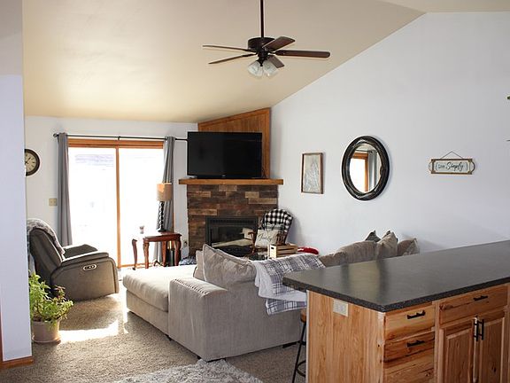 Desired Location! 1-story "condo" on the outskirts of Red Lodge with 3 bedrooms, 2 full baths, and 2 car attached garage. Spacious living area, vaulted ceilings, gas fire place with stacked brick face, and in-floor gas heat. This 1241 Sq. Ft. home packs a lot! Kitchen has plenty of hickory cabinets and a quaint dining area. Front covered patio with plenty of room to BBQ and a short walk to Rock Creek. Fully fenced backyard with patio, lawn, lilacs and a tree. Both short and long term rentals okay-please see HOA documents.