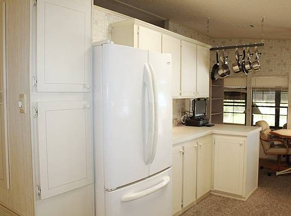 Listed by the OFFICIAL SALES OFFICE of this community. Great home ready for immediate occupancy, with a desirable floorplan and vaulted ceilings. Nice open living room with access to the lanai. Bright kitchen with white cabinets, white appliances with glass top range, breakfast nook surrounded by windows and adjacent to the front lanai. Dining room with built-in storage cabinet. Nice architectural lines created by the vaulted ceilings, kitchen/living room wall and master bedroom/bathroom wall. Large master bedroom, walk-in closet and luxury master bathroom. Guest bedroom has direct access to second bathroom. Raised lanai with vinyl windows and ceiling fan. Extra deep carport can accommodate several cars. Oversized shed with workbench. Convenient storm shutters. Furnished. This home is in a very active, 55+ community with many clubs, sports and activities for the residents. Amenities include two swimming pools, three clubhouses, hot tub, sauna, state-of-the-art fitness center, library, billiard room, shuffle board, tennis courts and pickle ball courts. HOA fee includes: site lease, water/sewer, trash/recycle, lawn mowing, basic cable, 24 hour attended gatehouse and access to all community amenities.