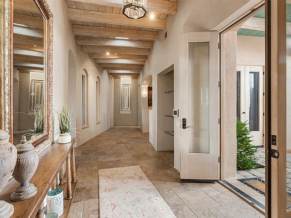 CASA DE LAS FUENTES | Welcome to "The House of Fountains", an awe-inspiring residence spanning approximately 3,995 sqft of sophisticated living space, nestled on a spacious 2.57-acre lot with Western Views. This architectural gem offers a harmonious fusion of soft contemporary design, Santa Fe style, water features, and natural grandeur, promising an unparalleled lifestyle. Through the private courtyard, step inside this single-level sanctuary, where 3 generously sized bedrooms and 3.5 bathrooms with an office and library unfold seamlessly across the expansive floor plan. The guest bedrooms are beautifully separated from the living spaces and primary suite. Vaulted ceilings add an air of grace, creating an open and inviting atmosphere throughout. The chef's kitchen is a culinary pleasure, equipped with high-end stainless-steel appliances, granite countertops, dual sinks, oversized pantry, and a breakfast nook. The primary suite, a haven of tranquility, boasts a spa-like bathroom and a private deck with a built-in hot tub overlooking the breathtaking landscape. With in-floor radiant heating beneath the stone floors and refrigerated A/C, this home ensures comfort in every season. A notable feature of this property is the three-car garage with separate bays, providing direct access to the house for convenience. The meticulously designed outdoor living areas are a cascade of luxury, offering panoramic views with the sounds of water strategically integrated to complement the natural beauty surrounding this estate. The residence includes a large cistern that nourishes the fully landscaped gardens. Witness the vibrant burst of colors and textures in the gardens during spring, summer, and fall, creating a picturesque backdrop for your everyday life. Indulge in the essence of luxury living, where every detail has been considered for comfort and enjoyment. "The House of Fountains" beckons you to experience a lifestyle of timeless elegance surrounded by the beauty of nature.