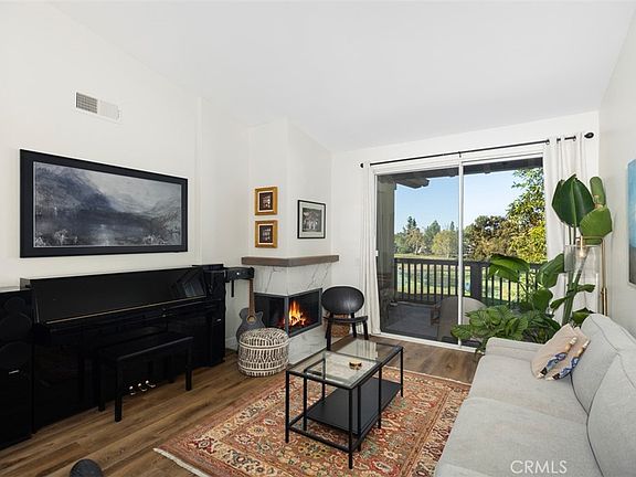 Experience breathtaking views in this completely remodeled 2-bedroom, 2-bathroom upper-level property overlooking the Tijeras Creek Golf Course. Enjoy serene vistas of the golf course, lake, fountain, and waterfall from the living room, patio, and primary bedroom. This home features luxurious upgrades, including elegant vinyl plank flooring throughout, tastefully remodeled bathrooms with marble tile shower and tub enclosures, white wood cabinetry, quartz-style vanity tops, and stylish black hardware. The primary and secondary bedrooms are equipped with built-in closet organizers and wood blinds for convenience and sophistication. Additional highlights include a stunning quartz-style marble fireplace, soaring volume ceilings, and a laundry closet with a stacked washer and dryer. For parking, the property offers both a private one-car garage and a designated carport. Residents also have access to exceptional community amenities, including two pools and a fitness center, offering a perfect blend of relaxation and recreation.