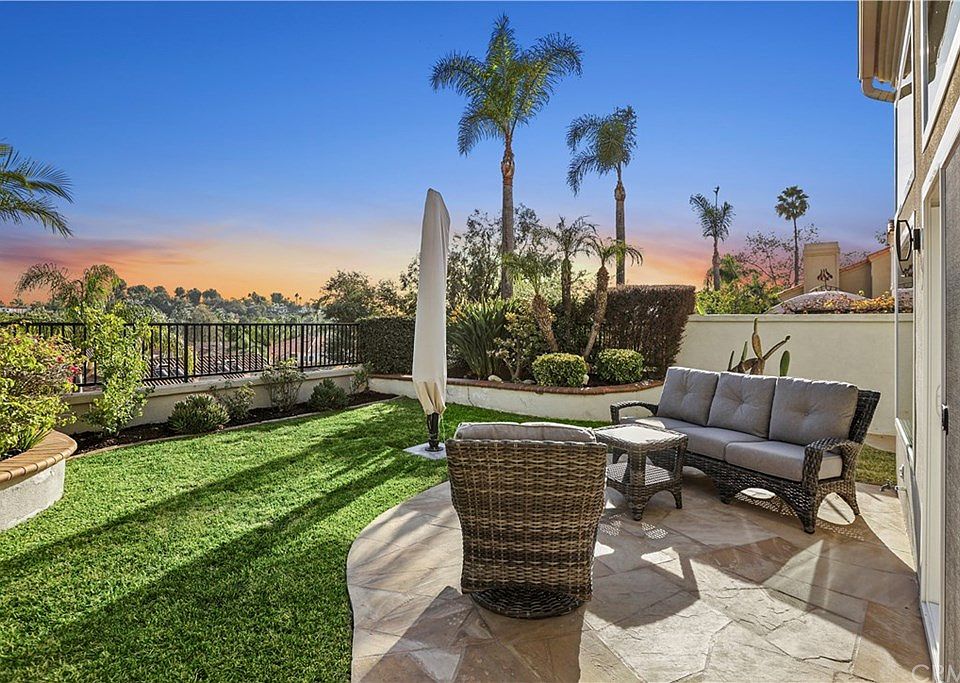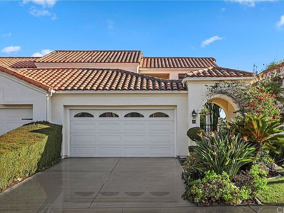 INCREDIBLE VIEW HOME! PERCHED ON A HILL, SITUATED NEAR THE END OF A CUL-DE-SAC, DUAL MASTERS WITH REMODELED BATHROOMS, MAIN FLOOR BEDROOM, UPGRADED KITCHEN AND PRIVATE BACKYARD! Tranquil outdoor setting with treetop and hillside views, southeast facing, grass area, wrap around entertainment area, stone hardscape and new sunshade umbrella. Upgraded kitchen with white cabinets, tons of countertop and storage space, granite counters, wine refrigerator, stainless steel appliances, kitchen window sink and open to dining area. Living room and dining room both with sliding doors leading to a serene backyard setting, creating the picture perfect indoor-outdoor with lots of natural light. Interior highlights include new dual pane windows and sliding doors, new electronic shades downstairs, new shades upstairs, newer hardwood floors on the stairs and upstairs and no carpeting throughout. New AC and furnace in 2018! Dual masters with vaulted ceilings and both bathrooms fully remodeled with stone counters, stone floors, stone shower, frameless glass shower doors, dual showerheads, upgraded cabinets, newer hardware, upgraded lighting and one master with a rain shower and large walk in closet. Main floor bedroom currently configured as an office. Garage with newer epoxy floors and built in cabinets and drawers with granite counter. Enjoy Marina Hills resort style amenities including Olympic size pool, clubhouse, tot lots, tennis courts and beach trails. The perfect beach close, view home!