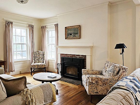 Built around 1850, this is one of the few large and noble brick houses in downtown Damariscotta. Its located on a quiet dead-end street, just 5 minutes from all the downtown offices, restaurants, & shops. With 5 bedrooms this is a grand house for a large family. The first floor master suite was built in the past 30 years or so and features views of the backyard, direct access to a screen porch and deck, and a master bath with unique spa/shower. Upstairs there are four bedrooms all accessed off the center hall and stair.