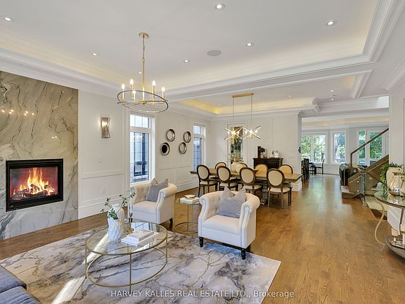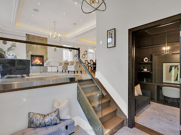 Magnificent Custom Home Nestled on a Quiet Court. Featuring a striking limestone and brick exterior, this residence showcases 4103 sq ft total ( 3003 upper + 1100 sq ft) lower a modern open-concept design with soaring ceilings and a contemporary open-riser staircase. The chef-inspired eat-in kitchen boasts a large center island, top-of-the-line appliances, a convenient servery, and a breakfast area overlooking the gardens, seamlessly connecting to the dining and living spaces. The family room offers a cozy fireplace and walkout to the terrace, enhanced by a skylight that fills the space with natural light. Additional conveniences include upper and lower-level laundry rooms. The primary suite offers a tranquil retreat with a spa-like 6-piece ensuite and walk-in closet. The lower level is designed for entertaining, complete with a wet bar, radiant heated floors, and a walkout to the yard. Nestled in prestigious West Lansing, this residence offers a rare blend of tranquility and convenience. Enjoy the charm of a quiet, tree-lined street with a country-like ambiance, while being just steps from scenic ravines, lush parks, tennis courts, boutique shopping, top restaurants, transit, and effortless access to Highway 401.