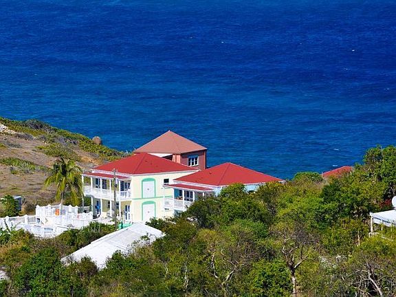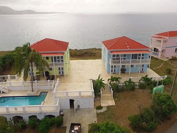 Windswept Villas Condominium, Unit 1, Water Island. 2BR/2BA end unit (1056 sq ft) with upgraded interior. Large common area pool (14' x 37') and deck. New hurricane rated windows, doors and shutters. Situated with 4 other units in the small complex on 1.32 acre waterfront (cliff ) lot. Unit 2 is also listed for sale and a door can be removed to provide for 4BR/4BA/two kitchens and two living rooms. Great opportunity for a large family vacation or live in one and rent the other unit.