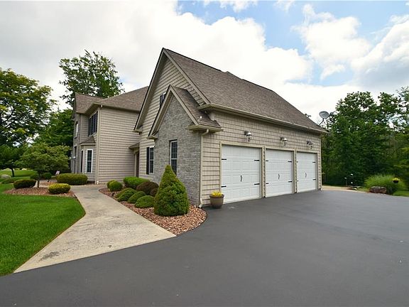 Absolutely beautiful custom built contemporary home! This wonderful home is located on an acre of land on a private drive in Creekside Court Subdivision. The inside is is warm and inviting with hardwood floors and a two story foyer and family room. The kitchen boasts granite countertops and Viking appliances and a built-in wine chiller. The large open family room lets the light shine in. The primary bedroom features a fireplace and a bath with whirlpool tub and walk-in tile shower. There are also two walk-in closets. The basement walks out to a wonderful patio with pergola and outdoor fireplace and overlooks the large back yard backing to Larkin Creek. Central vac, amazing patio, 3 car garage, 2nd floor laundry room and much more await!