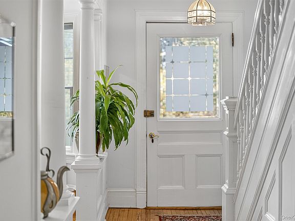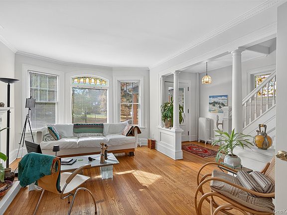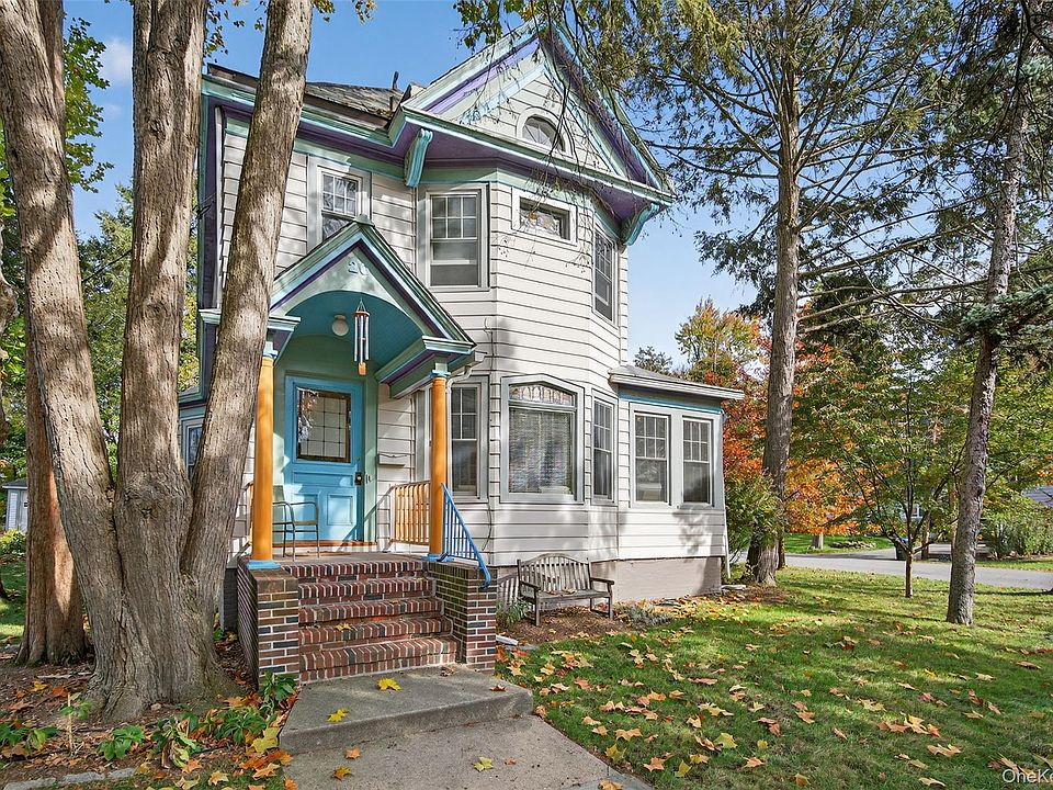 This home is filled with timeless details, featuring stunning stained glass windows and "large" windows in every room giving access to the outside natural environment. Original wood floors that flow throughout, showcase the homes historic charm. The main floor boasts a delightful layout with a bright and serene double parlor. The spacious and inviting dining room is a perfect spot to enjoy your morning sunrise. A lovely sun porch, currently used as an Artist's studio, adds extra living space. The updated gourmet kitchen is a chef's delight with sleek Silestone countertops and high-end Bosch appliances. For comfort and convenience, the primary bedroom includes a full ensuite bath and another full bath upstairs. There is also a convenient half bath with a pedestal sink located on the first floor. Outside, you can enjoy sunsets from the front and a serene meditation grove in the beautiful yard. You'll have peace of mind with a new boiler. The detached two car garage adds an abundance of additional storage. This prime location is just minutes to Metro-North and major highways, close to the Culinary Institute of America, Vassar and Marist colleges, and the Rail Trail.