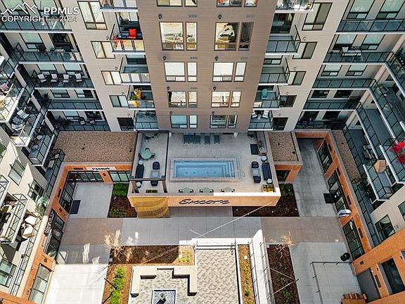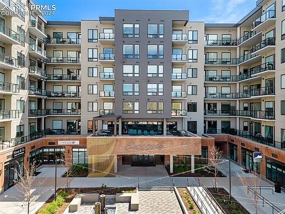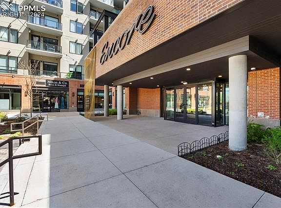 Imagine being steps to restaurants, shops, cafes, salons, and Festival Park -- where there are weekly events such as Farmer's Markets, Art Shows, and live music. A true downtown lifestyle in the highly-desirable Encore building, right in the heart of downtown Castle Rock. The newly-built condo building features a contemporary and sophisticated design and offers amazing amenities that cater to everyone. This 2nd floor unit has an ideal, west-facing direction overlooking the courtyard with scenic, hilltop views. Stylishly designed and beautifully updated, the condo features premium, Hunter Douglas electronic blinds, Google smart home technology, newly installed laundry room storage, and includes two deeded parking spaces. The open floorplan has coveted 10-foot ceilings and is oriented around generously-sized windows with views. The stunning kitchen showcases slab quartz countertops, stainless-steel KitchenAid appliances, and a large center island with seating, plus the adjacent dining area is large enough for entertaining. The spacious primary bedroom features an ensuite luxury bathroom, equipped with frameless glass shower, quartz countertops, and double vanity. Living at the Encore is truly a lifestyle. The amenities include a well-equipped fitness center, clubhouse with kitchen and pool table, 25-person jacuzzi, lounge with golf simulator, dog park, pet spa, outdoor lounging areas with fire pits and grills, and sleek common areas for working or relaxing. Two deeded parking spots are also included. Onsite security and key fob entry keeps the building safe and secure and the units have smart, keypad locks for easy access. The location offers an easy commute to Denver, DTC, or Colorado Springs and there’s so much to do right at your fingertips. This is the best of luxury and low-maintenance living. Don’t miss this opportunity!