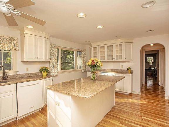 A rare opportunity to buy a Semple-built home in highly desirable Westwood Acres--a quiet, established neighborhood close to commuter rail and highway access. This 8-room Cape has a sunny kitchen with cream-colored cabinets, granite countertops, an island with a seating area and additional storage, and refinished hardwood floors. The adjacent living room has a brick fireplace with a classic mantlepiece. Off the hallway from the kitchen are a bedroom and an open dining room, which have refinished hardwood floors, and a full bath. The dining room opens onto a family room with a brick fireplace--great for gatherings--and a master bedroom with en suite bath. Upstairs are 2 front-to-back bedrooms, both with gleaming hardwood floors, and a full bath. The home has an attached garage, glass-enclosed breezeway, rear deck, brick patio, and large landscaped yard for outdoor entertaining. Updates include a new septic system, fresh interior painting, and a 5 yr. Weil-McLain boiler and newer oil tank.