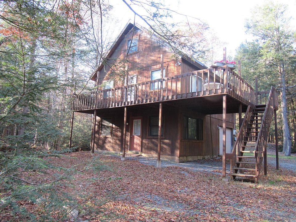 ONE OWNER SAYS IT ALL- Come see this 3 BR, 2 BA, raised chalet that has been well cared for and maintained from the time it was built. Tucked away on over a half an acre featuring a full basement w/a free standing wood stove, a beautiful stone wall and T-1-11 on the other walls, utility room w/washer and dryer, 1 car attached garage w/new garage door and opener, Tilt-In Anderson windows throughout and a wrap-around deck. Enjoy privacy and all that nature has to offer. This home is located in a gated community w/2 lakes, low dues and taxes, easily accessible from 1-80 and PA Turnpike, close to Big Boulder/Jack Frost Ski resort and many other Pocono attractions for year-round FUN!