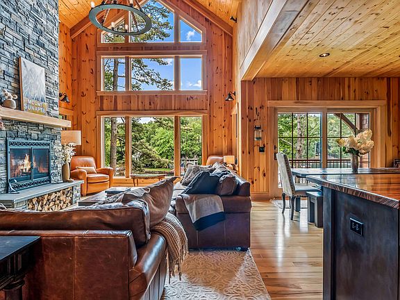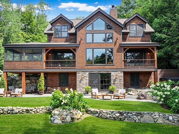 This Lake Sunapee Craftsmanhome is a true retreat, blending luxury with a cozy, rustic charm. Built in 2015 by award winning Old Hampshire Designs, this home boasts an open-concept design featuring towering windows, multiple balconies, and a screen porch that seamlessly integrates with the lush lawn and lake views. The interior is adorned with warm wood tones and natural stone, enhancing its elegant yet inviting atmosphere. Upon arrival, you'll be greeted by a winding drive leading to a beautifully landscaped entry. The centerpiece of the main living area is a commanding native stone wood-burning fireplace, visible from almost every room. The chef's kitchen is a standout with top-tier appliances and ample storage, making it perfect for culinary enthusiasts. Dining options abound with a lakefront dining room, a porch area, or even a spot down by the water. The first-floor primary bedroom features an en-suite bath. Upstairs, three spacious bedrooms open onto a central family area and share a large bath. The lower level is designed for entertainment, featuring a versatile space for pool or ping-pong, a media area, and a bunk room that comfortably sleeps six. Outside, the lakeside area offers a variety of relaxation options, including an outdoor living room, a discreet hot tub, and a deep-water boathouse with a large wharf perfect for enjoying western sunsets. The oversized two-bay garage is perfect for storing lake toys and skis.