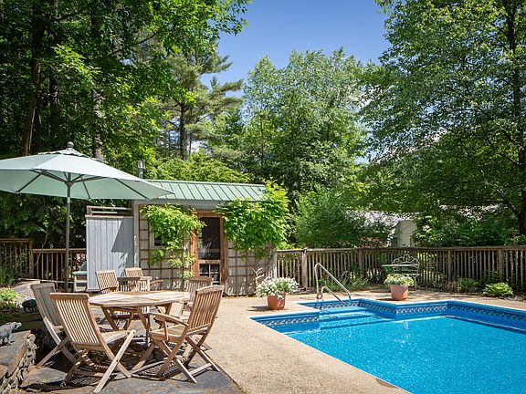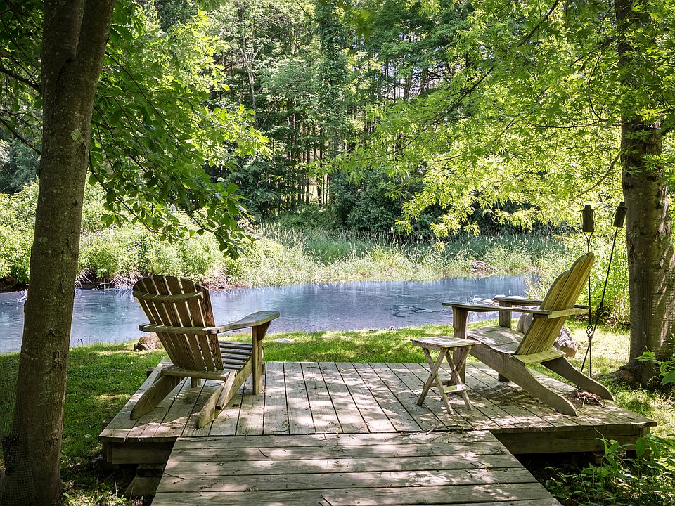 This one-level contemporary home will transport you to a peaceful enclave with easy access to downtown Great Barrington. Set on 20 enchanting, private acres with lush greenery, a deck leading to secluded frontage on the Williams River, the open, sunny, floor plan has vaulted ceilings, a great room with fireplace, master suite with fireplace, second bedroom with fireplace and two additional bedrooms. Enjoy the private heated pool, patio and three unique outbuildings, in addition, to a small guest cottage/studio, enchanting custom tree house, and walking paths throughout the property. An absolutely magical place, truly one of a kind.