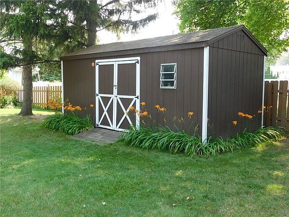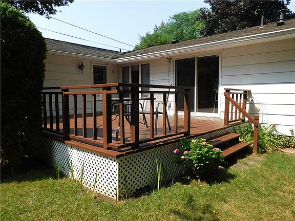 ranch home for single floor living. 3 bdrms, living and dining room with wall to wall carpeting all over hardwood floors. Eat-in kitchen with ceramic backsplash and NEW laminate flooring just put down in July 2021. Oak cupboards, appliances included. Sliding door in dining room exits to 19-4 x 16-4 deck. Spacious family room with wall to wall carpeting with bay window and wood burning fireplace. Bathrooms with ceramic floors, vanities and vent fans. Basement has a finished room which is great for versatile uses. Good mechanics. Forced air gas furnace 90% efficient. Central air 2015, Hot water heater 2017. Roof 2006. Nice part fenced yard with flowering plants. Large 10 x 20 shed. Good location close to Town Park and easy access to 390. Whole package is a nice offering! Please allow 24hrs for Life of Offers.