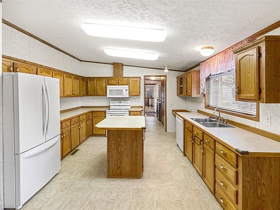 This 2007 manufactured home is ready and waiting for its new owner! The home features a bright and open kitchen with a generous amount of cabinetry, countertop, built-in desk area, island, and is open to the dining area. The spacious living room is just off of the kitchen/dining room and has a full-sized picture window. The master bedroom is separated from the other two bedrooms and boasts a walk-in closet plus an en-suite bathroom. The other two bedrooms have walk-in closets allowing for plenty of storage. There is a second full bath with a built-in linen closet just outside the door. The laundry is perfectly located right inside from the deck/garage entry and the washer/dryer are included! The garage is finished with plenty of space for storage & projects, plus it is heated. There is a yard shed for extra storage and the home sits on a corner lot and has additional alley access.