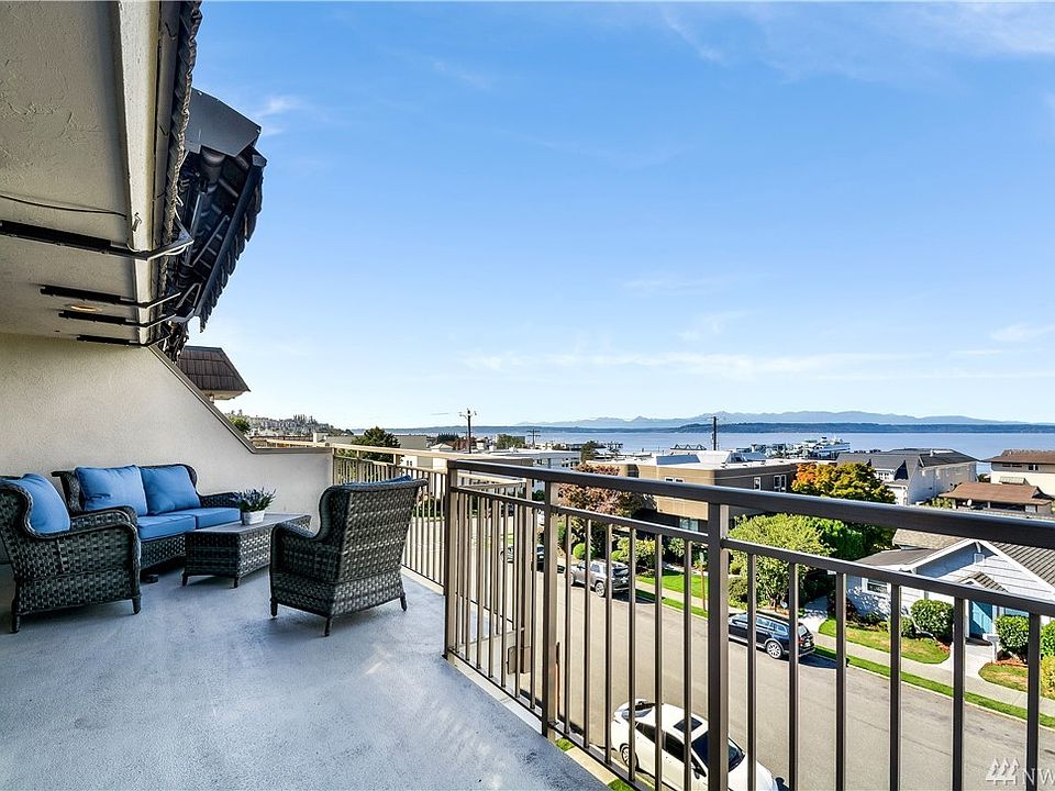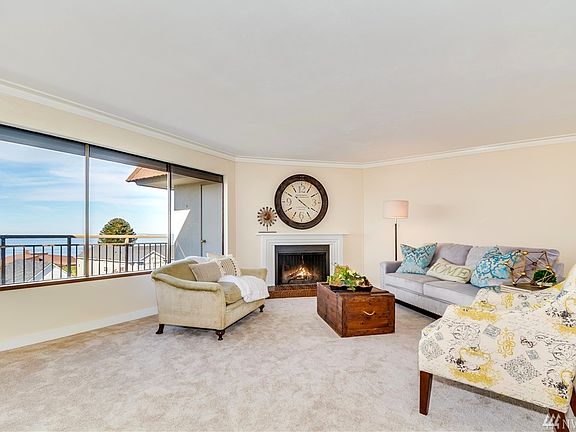 Sweeping Sound and mountain panoramic views from the open living areas & entertainment balcony await you at this rare, top floor home! Extra-large rooms thru-out including the master suite with walk-in closet. Separate laundry, lots of storage & 2 parking spaces. This 2 bdrm, 1.75 bath unit has new carpets, kitchen/laundry floors, bath vanities with quartz counters, main bath tile surround and fresh door/trim paint. A short couple of level blocks to restaurants, ferry and beaches! Age 55+ bldg