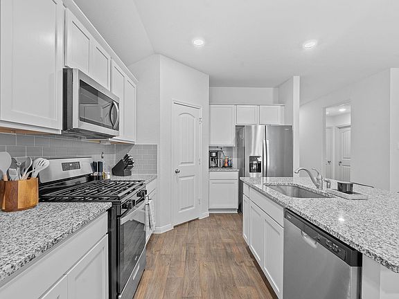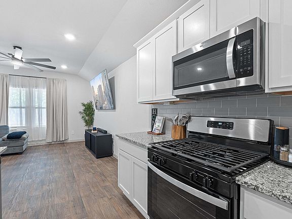Attached garageFully fenced yardGranite countersStainless appliancesCovered patioOversized walk-in showerWhite shaker cabinets