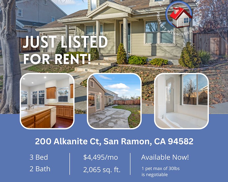 Schedule a Showing Online Don't miss out on this charming 2,065 sq. ft. 3 bedroom, 2 bathroom home off of Dougherty Rd. The home is located in a small cul de sac in the highly desirable Gale Ranch area of San Ramon. The home offers a fully carpeted family room and formal dining room with high ceilings and large windows for great natural light. The kitchen offers an open layout with a center island, dual ovens, and tons of cabinet space. Adjacent to the kitchen is a small dining area and the bright living room space with built-in shelving, a desk space and a cozy gas fireplace. Down the hall from the kitchen is the fully carpeted master bedroom that comes with two walk-in closets, and the ensuite bathroom. The master bathroom offers dual sinks, a standing shower and separate bathtub, and private toilet room. The second and third bedrooms are fully carpeted and share a hallway bathroom with a tub/shower combo. The house comes complete with a separate laundry room and 2-car garage. The neighborhood is close to premier San Ramon City Center, Bishop Ranch Park, San Ramon Community Center and Dublin/Pleasanton business parks. It is also located in the top-rated and sought-after San Ramon Valley Unified School District. We are looking for a long-term tenant who will take excellent care of the home. Available for move-in ASAP Rent: $4,395.00/month Security Deposit ranges from $5,495.00 - $8,790.00 unless you qualify for our zero security deposit option provided by Obligo. Applicants that do not meet all the Basic Criteria, but exceed the Minimum Criteria, may be approved with a higher security deposit. If you qualify for Obligo's service, you will not be required to pay a security deposit! Preferred Lease Term: 12 months Pet Policy: 1 pet max weight 30 lbs is negotiable with a $500/pet security deposit increase and a $30/month pet admin fee. Applicants with pets are required to submit a pet application through a third-party pet screening service at https apms. Refrigerator: Included Washer/Dryer: Included Gardening: Tenant's responsibility Parking: 2-car garage Utilities: All utilities are the Tenant's responsibility Showings are available by appointment only. Schedule a showing online by clicking the Schedule a Showing link. The property is professionally managed by Advantage Property Management Services. Leasing Contact: Harrison Smith (DRE# 01902063) READ THIS IMPORTANT INFORMATION BEFORE YOU SCHEDULE A SHOWING There is a $50/adult non-refundable application fee and ALL adults residing in the property must apply. We will (1) verify your identification; (2) check your credit report, unless you receive a Government Rent Subsidy and request to provide verifiable alternative evidence instead of a credit report no later than when the application is submitted; (3) verify your household income and employment, if applicable; and (4) verify your rental history with previous landlords. Most applications are processed in 2-3 business days from the date we receive a completed application and all supporting documentation. Security Deposits are calculated using a risk-based model. Applicants who meet all the Basic Criteria may be approved at the advertised security deposit amount. Applicants who do not meet the Basic Criteria but exceed the Minimum Criteria may be approved with a higher security deposit, not to exceed the legal maximum. We offer a security deposit-free option for qualified tenants using Obligo billing authorization technology. Security Deposits for active-duty military and properties subject to AB12 cannot exceed 1x the rent. Prior to move-in, proof of a current renters insurance policy with APMS listed as an Additional Interest and coverage of at least $300,000 for personal liability must be provided. Please DO NOT APPLY if your credit score is below 650, your household income is less than 2.5x the asking rent, you have ever been evicted, you have negative rental history, or your pets do not comply with this property's pet policy. If you have a Government Rent Subsidy and elect to provide verifiable alternative evidence of your reasonable ability to pay rent instead of a credit report, you must inform APMS when you submit a rental application. Failure to notify us at this time may disqualify you from participation in alternative verification. We will provide a list of required documentation after we receive a request. All documentation must be provided within 48-hours. Contact us to learn more about this process and the required documentation. All verifiable sources of income will be considered. Pursuant to CA Gov. Code 12955(o), the income multiple is based on the amount of rent that will be paid by the Applicant (not the total rent amount) if the Applicant has a rental voucher or other housing subsidy. To help ensure all residents understand our animal policies, all Applicants must submit an animal application at https apms. All Information Deemed Reliable But Not Guaranteed. APMS is not responsible for content published by third-party listing websites (i.e. Zillow, Trulia, Hotpads, etc). Central Heat/Air Disposal Pets Allowed Refrigerator Included Washer/Dryer In Unit Washer/Dryer Provided