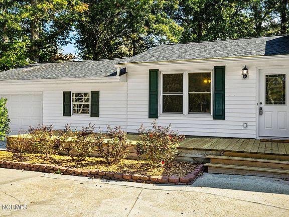 This fantastic, corner lot home is just what you've been looking for! When you pull up, you're greeted by a huge front yard, complete with plum and pear trees, and the large front deck, to enjoy those cool Carolina evenings. Inside the front door, you'll find low maintenance LVP flooring leading to the dining space and living room on your left, and into the kitchen and laundry area straight ahead. The living room is spacious and also features a decorative fireplace. On the right side of the home, you'll find the three bedrooms and two full bathrooms. The garage is a mechanics dream, with a one car garage door and large workspace. The back yard has trees that are perfect for hanging a hammock on. This home boasts new paint throughout, a new hot water heater in Oct 2021, a new roof in 2018, and a new garage door in 2019. Now it just needs a new owner! Set up a time to see it today!