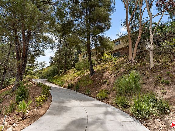 Spanish treehouse on over 3 private acres in equestrian community! Perched among the trees up a private drive, this home exudes warmth and charm. This special compound has something for everyone. Excellent floor plan, sparkling pool, yard for playing and huge upper field for animals or vines or sports. The home welcomes you to a formal entry and large light filled living room. The dining room looks out to trees from every angle and connects seamlessly with the kitchen and living room. The open kitchen features a center island, granite countertops, eat-in area, walk-in pantry and flows into the spacious family room. The family room has a fireplace, reading nook, walk in closet and sliding doors to a big patio. The patio also has a fireplace and creates a perfect place for al fresco dining and entertaining. A full laundry room, powder room and 3 car garage complete the first floor. Upstairs, in addition to the primary suite, are 3 huge bedrooms with custom closets as well as a full bath with dual vanity. The primary suite is a dream with beamed vaulted ceilings and a gorgeous fireplace and large covered deck overlooking the pool. The primary bath features a sunken tub, separate shower, dual vanity, and spacious walk-in closet. A gigantic bonus room with full bath completes the upstairs. This room has soaring beamed vaulted ceilings, skylights, ceiling fans and its own private deck and separate entrance making it perfect for an office, guest suite or playroom. Outside the pebble finish pool and spa beckon with lots of seating areas and privacy. The elevated yard makes for a great area for toys and play. Up the hill just a bit is a huge flat pad that could be transformed into a paddock, sport field/pickleball, or whatever you can dream up. A hillside area would make an excellent fruit tree garden or vineyard. The possibilities are endless for this lovely property in 24-hour guard gated Bell Canyon with its equestrian center, trails, park, gym, tennis, pickleball, children's events and award-winning schools.